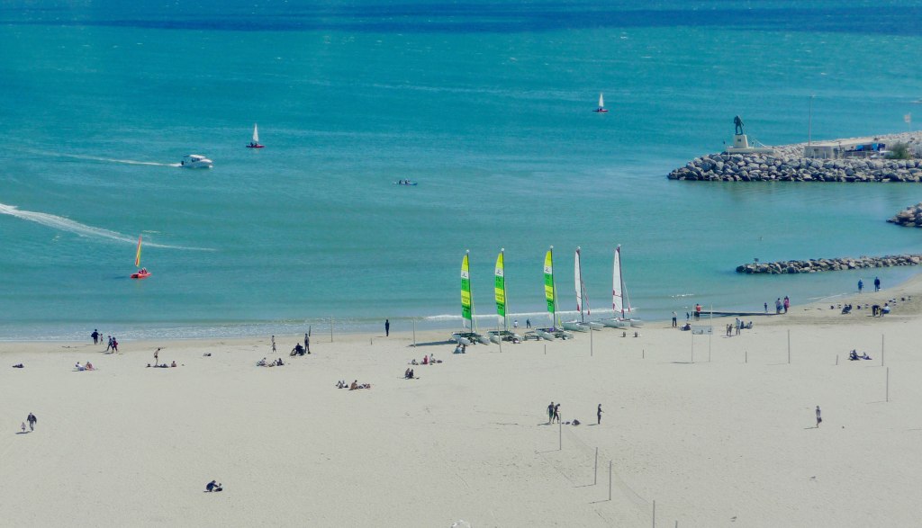 The sprawl of apartment buildings that is a backdrop to the beach either side of the centre is not especially handsome but the little harbour is attractive and from the small concrete pier are some good views of the town and across the bay to La Grande Motte.   And as I said, the good stretch of sandy beach is an ideal spot for families and couples to enjoy the facilities on offer.