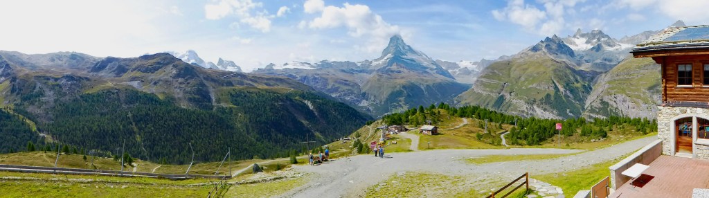 Locarno, a Swiss town on the Italian/Swiss border was another interesting day trip from Stresa by train and coach, and across the border and into Switzerland was Zermatt, a town which turned out to be completely different to what I’d thought it would be.  I had imagined sophistication and high rises but instead, I got a villagey atmosphere – rustic wooden houses and hotels but with high-end prices.  The highlight of my visit to Zermatt was the trip on the funicular to the top of the Rothorn from where I had a spectacular view of the Matterhorn, sadly not covered in snow, but with plenty of snow-covered mountains around me over which hang-gliders hovered, and plenty of hiking and walking trails to keep me occupied.