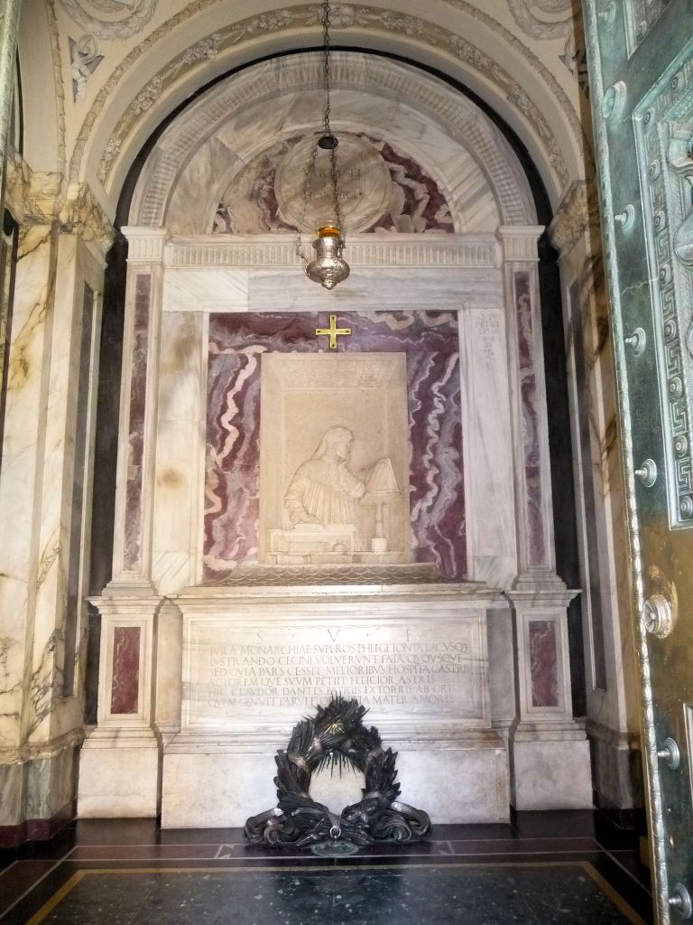 It is said that it was the lectures in praise of Dante given by fellow poet Boccaccio (who followed Dante’s precedent and wrote in the vernacular instead of Latin) which caused the Florentines to re-think their loss, and seventy-five years after Dante’s death Florence made the first of many requests for the return of his body. Ravenna said no! In 1430 Florence tried again, and again in 1476, but got the same firm “No” as an answer. Meantime, the sarcophagus was moved to the other side of the cloister and a sculptor was commissioned to make a marble bas-relief of the poet at work.