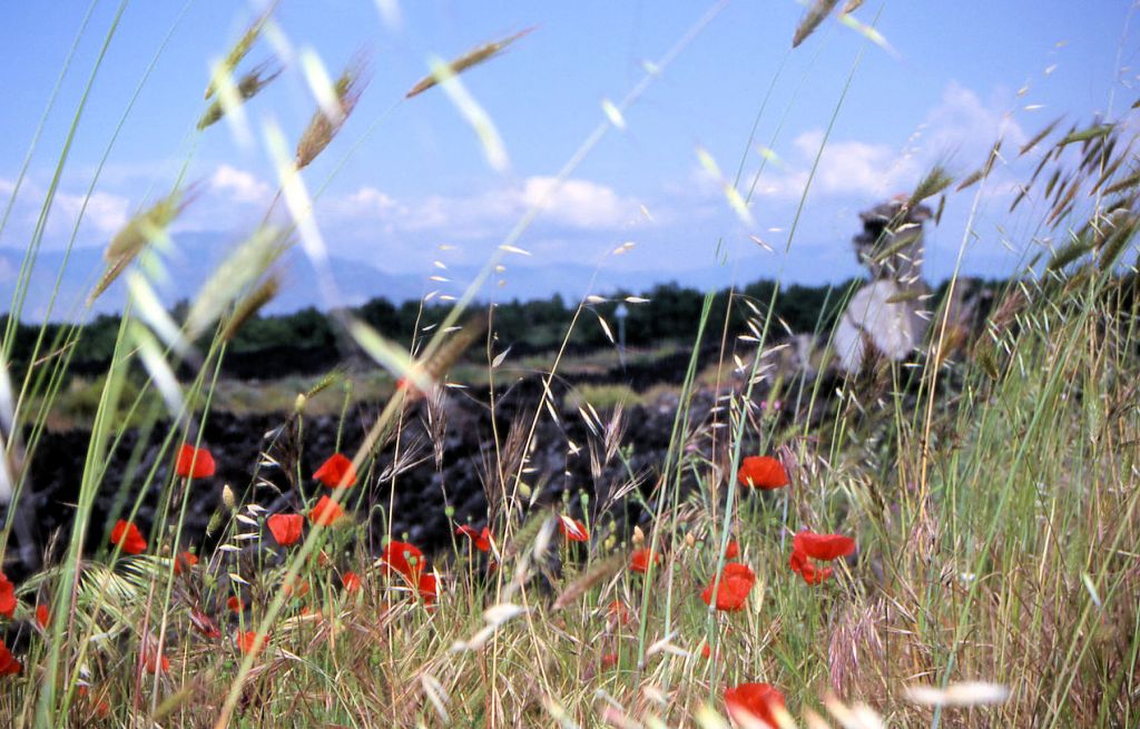 Wild poppies and grasses growing on the lava that had poured down from Etna in Sicily.