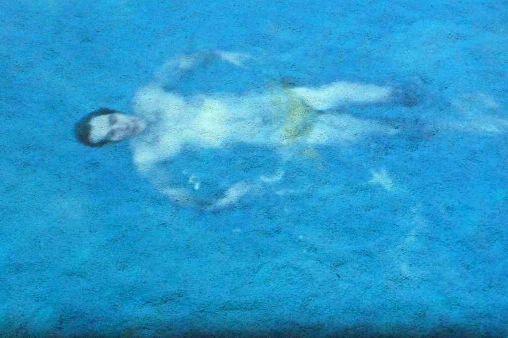 Thanks to modern technology and film projection, you can see and hear the splash as a Roman soldier dives into the water, and you then see him swimming in the pool. Then watch as women enter the water and swim together.