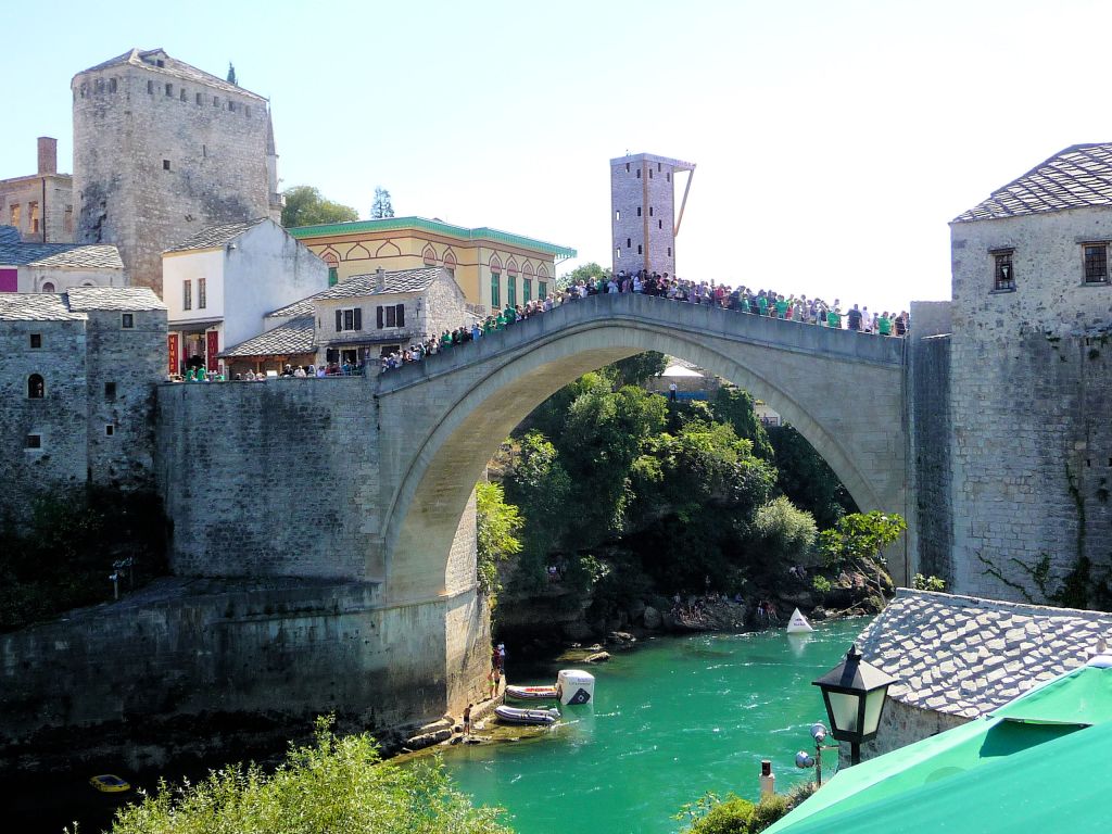 The first bridge is over the Neretva River in Mostar (Bosnia & Herzegovina) and the crowds on the top of the bridge are there to watch the Red Bull diving championships. The divers leap from the top of the tower on the bridge into the water below where there are safety precautions in place in case of accidents.