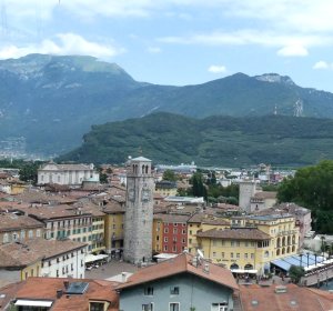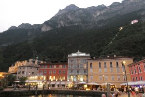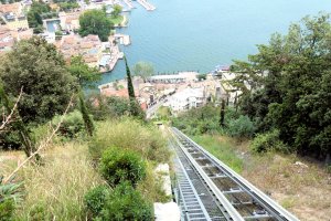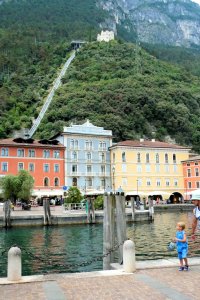 We are going up the mountain on the funicularHere we go, up, up and up.Looking down on Riva main square from the funicularAt the top, one of the mountain trailsRestaurant on the mountain looking down over RivaNight falls, restaurant, castle and funicular lit up.