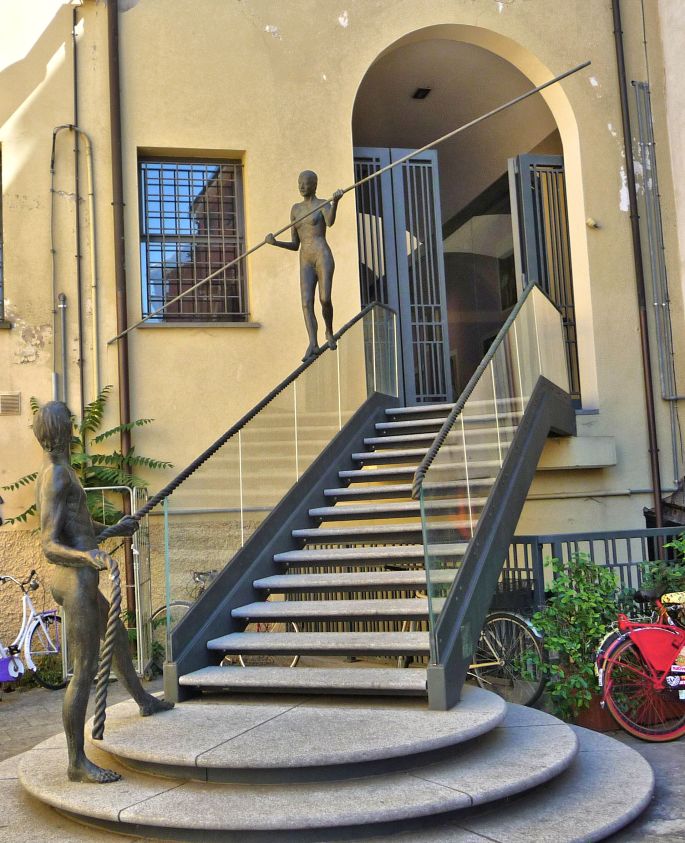 I stood before this amazing balancing figure with the corresponding male figure at the foot of the stairs for a long time, returning a few days later to try and get a better picture. I could never find a time when there were no bikes or cars or wheelbarrows parked in the space under the stairs and my efforts at removing them were not professional enough so I’ve left them in.