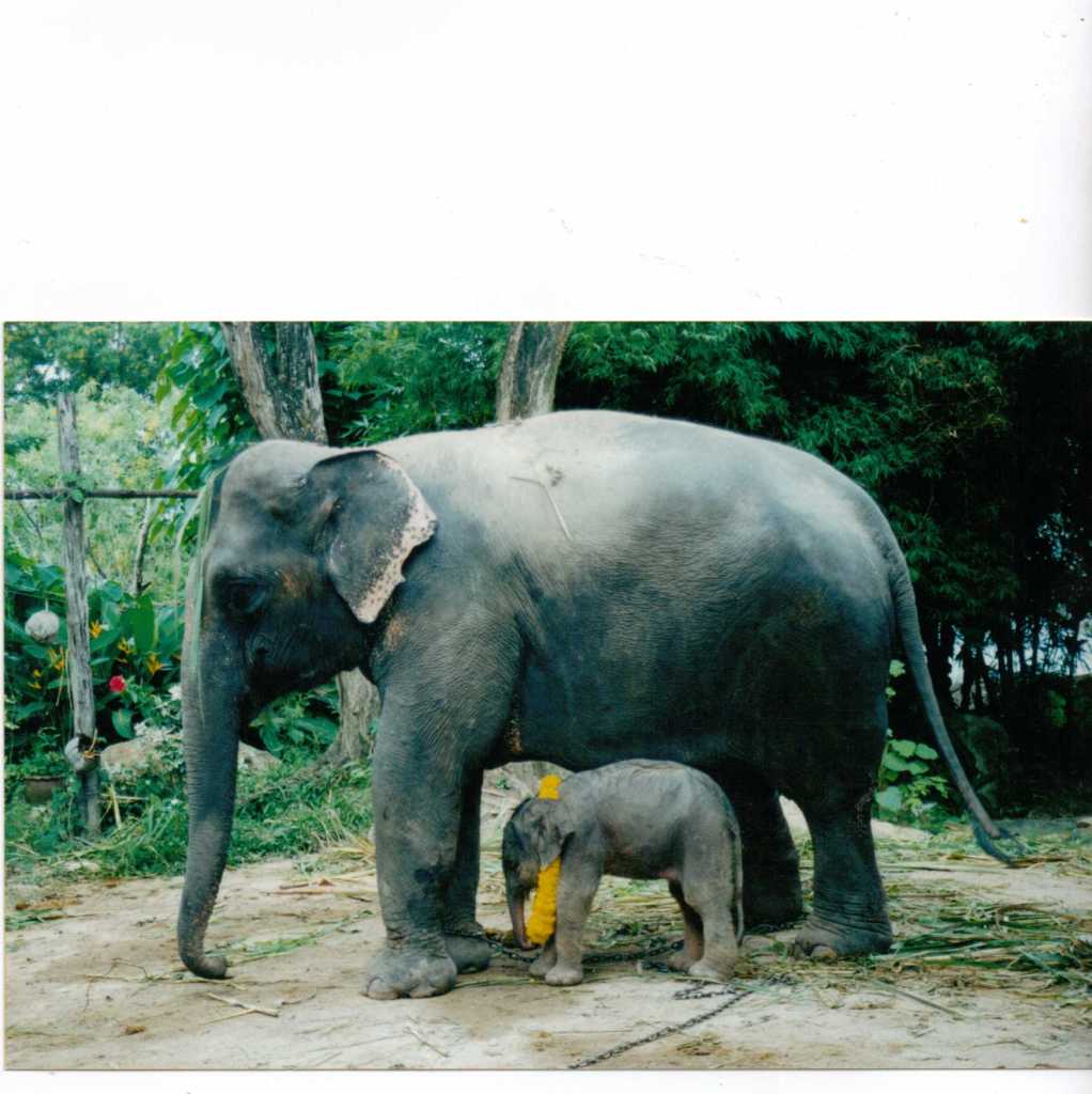 It’s one I took when I was doing some work with the Elephant Help Clinic in Phuket many years ago. The baby elephant is wearing a lei because she’d just been blessed by the monks from the nearby temple.