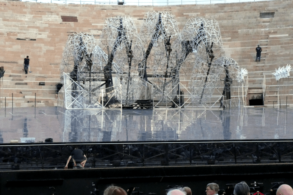 As dusk settled over the amphitheatre and a pale moon floated in the velvety blue sky above, anticipation was high. We’d watched the stage-hands sweep the tiered stage, watched the lighting engineers fiddle with the lamps, and wondered at the meaning of the objects that decorated the set, crystal pyramids, giant hands, and lighting designs which, although technologically modern, blended easily into the ancient Roman amphitheatre. Later I read that the giant white hands that dominated the stage represented power.